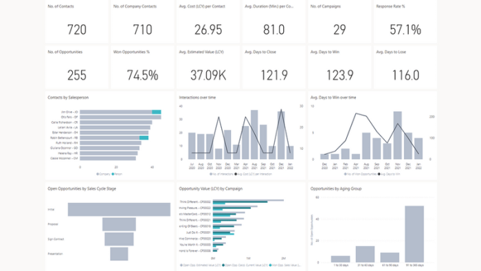 Take advantage of the immense amount of sales and marketing information Business Central collects. Our CRM report suite brings all of your data from Business Central together in a comprehensive way that allows you to analyse data and identify trends for all of your salespeople, contacts, interactions, opportunities, campaigns and segments.