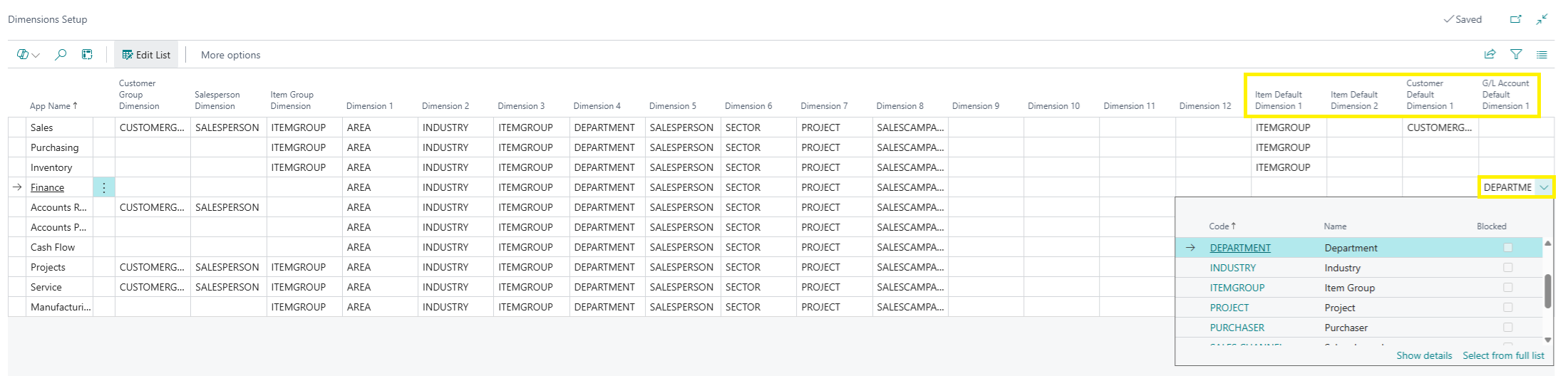 Please note that the Dimension Setup is app-specific. Each app can have a unique set of dimensions. For example, a Sales Campaign dimension might only be relevant for the Sales app, but not for the Purchasing or Inventory app.