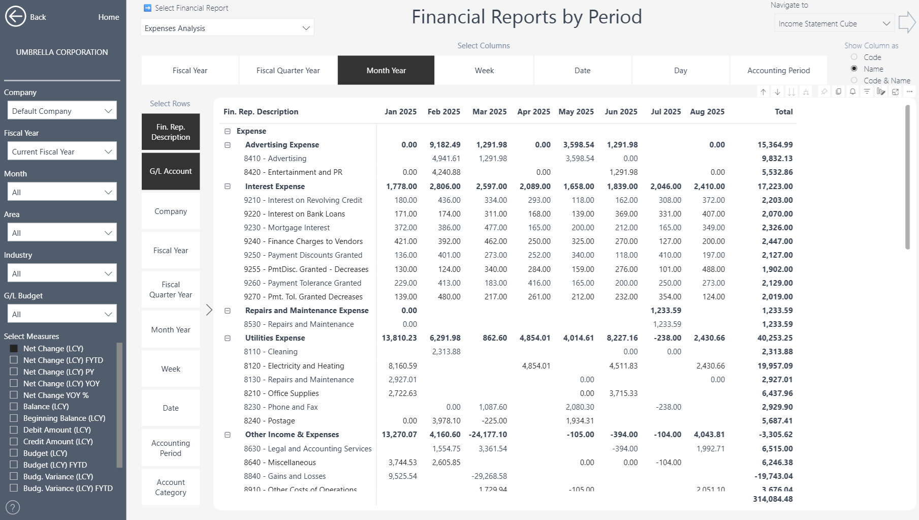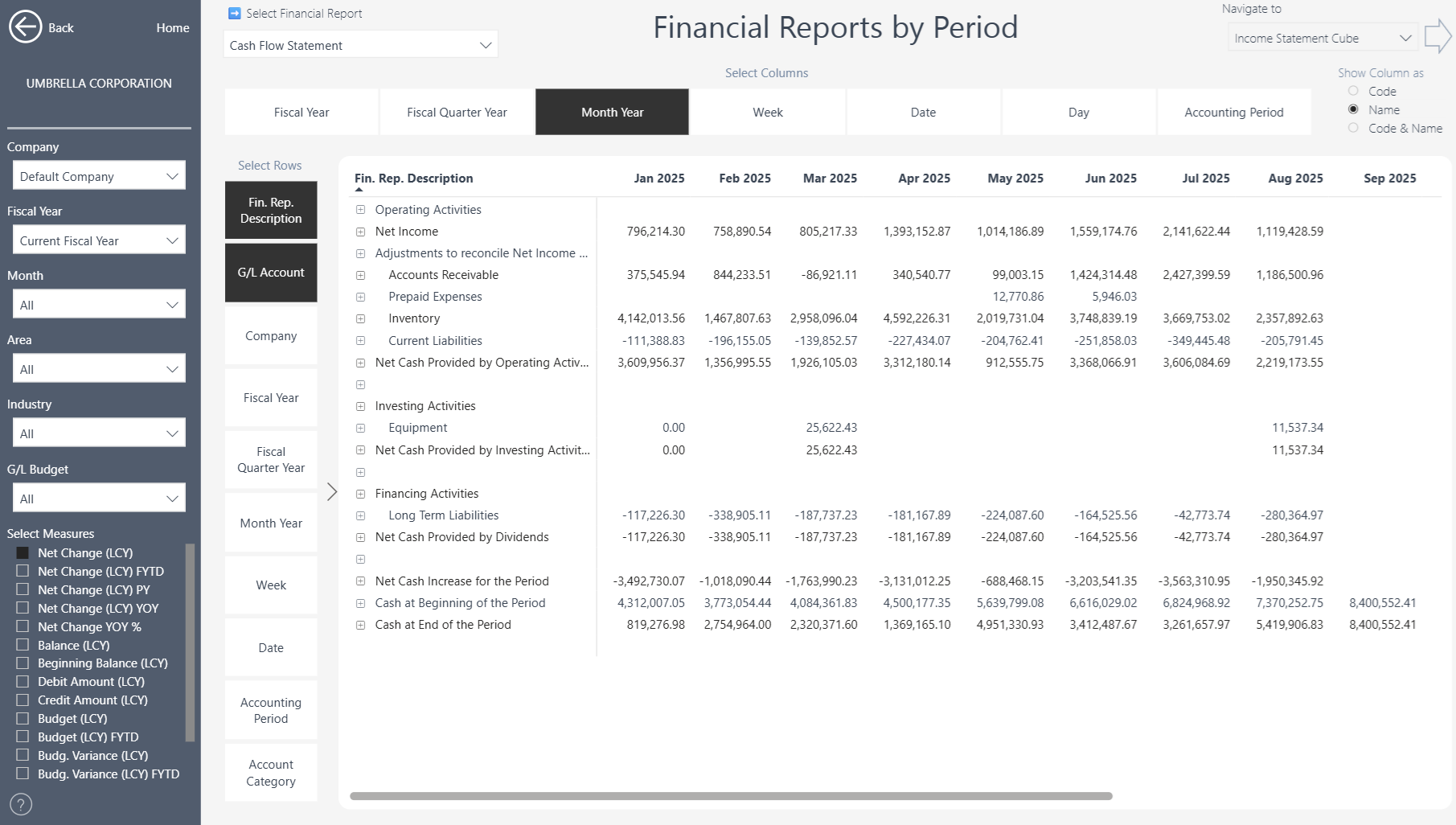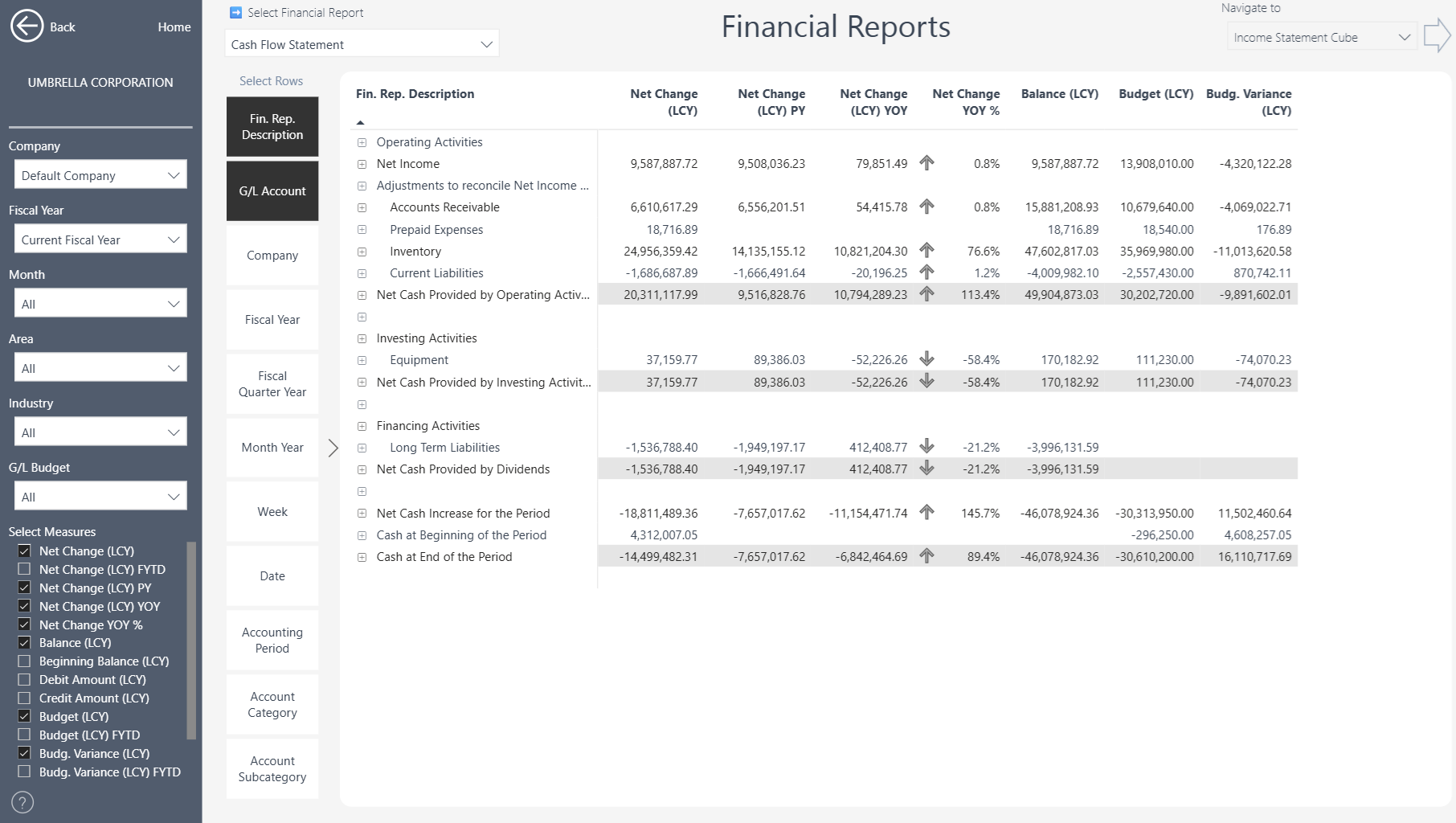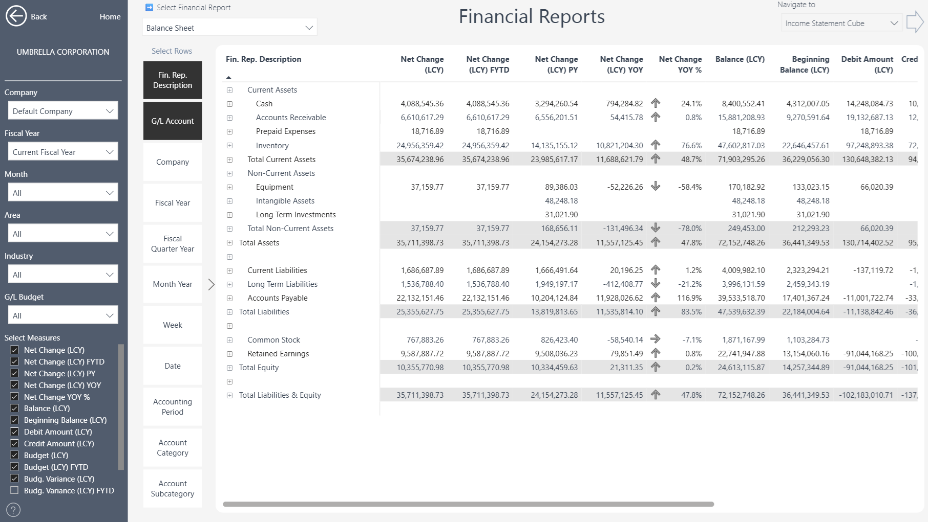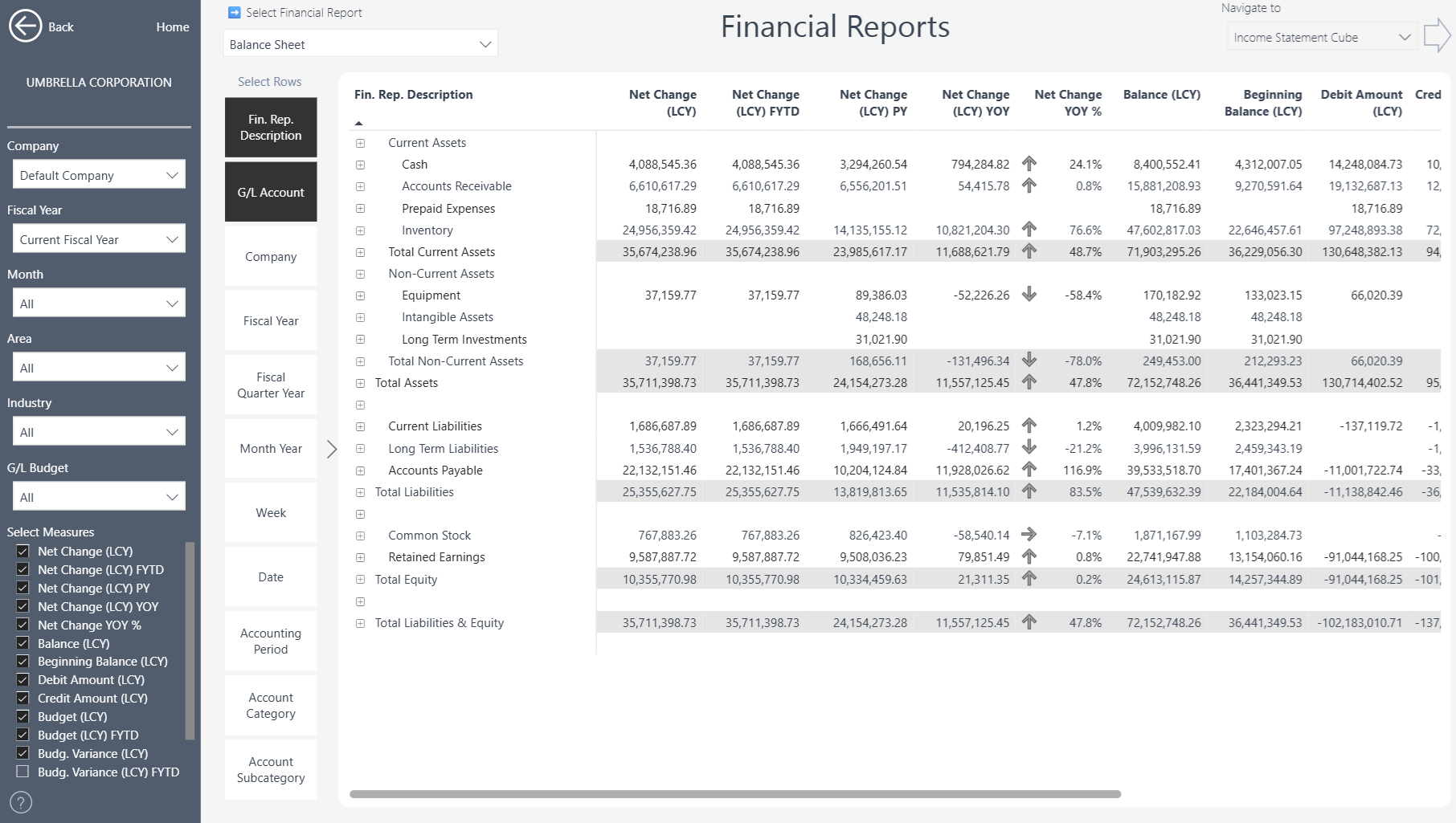 Once imported into Power BI, Financial Reports can be analyzed by: