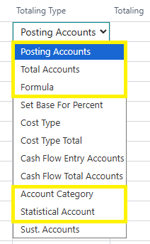 The totaling type determines which accounts will be totaled, that you specify in the Totaling field.