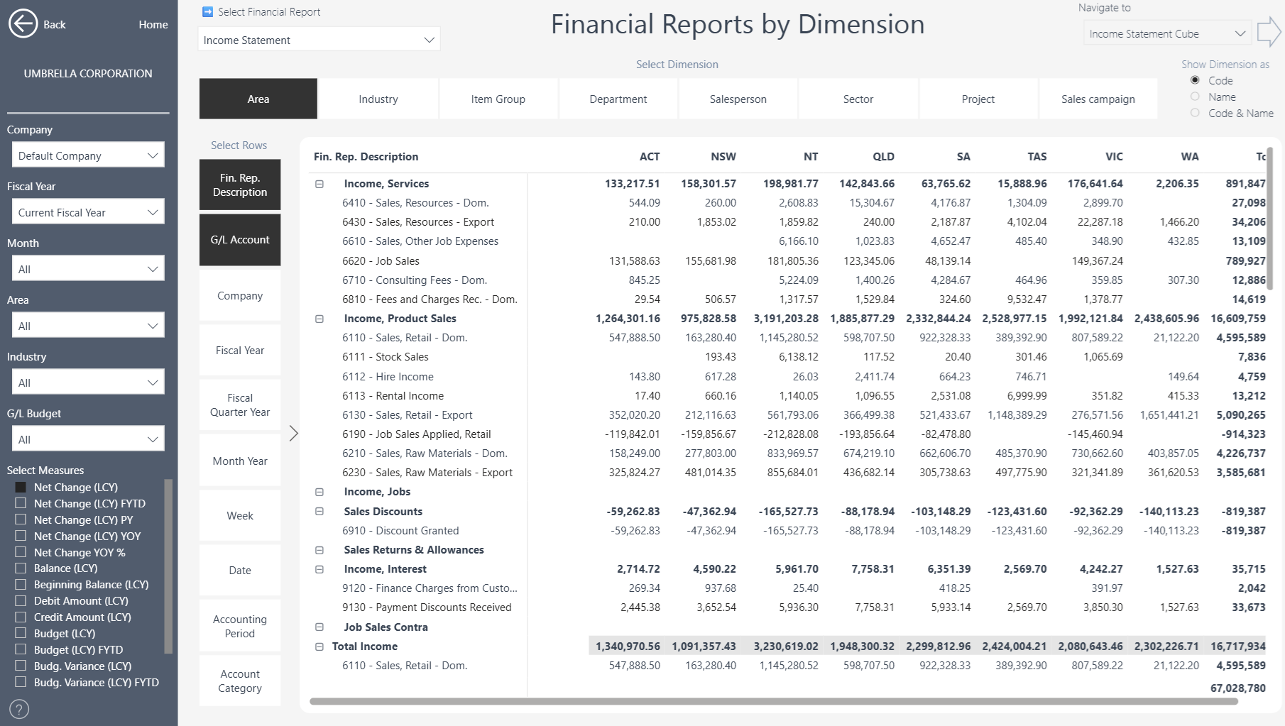 Dimensions – filter or group by whichever values your organization has configured (e.g. Department, Salesperson, Region, Project).