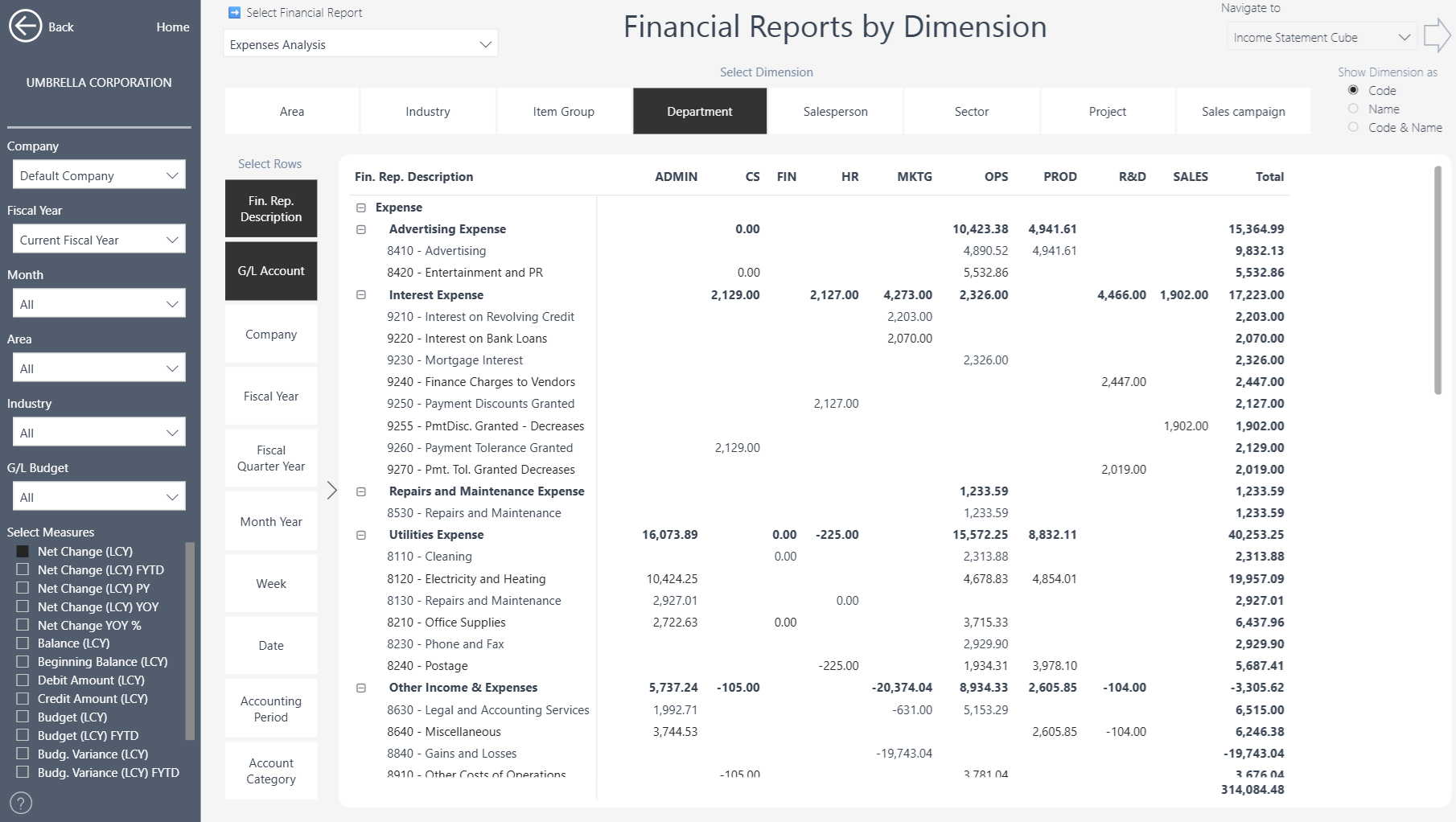 Or view expenses by Department or any other Dimension by selecting the tab in the column list.
