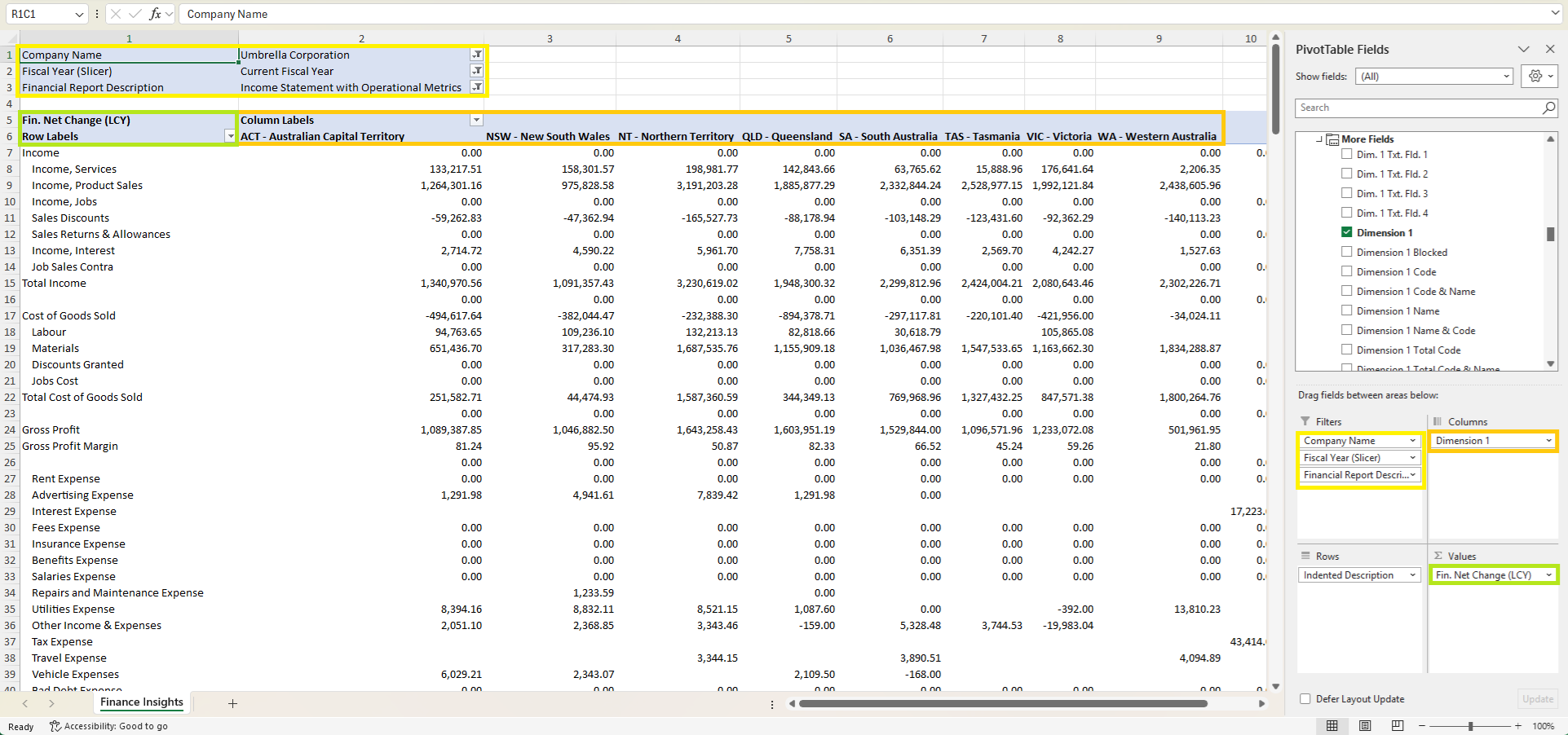 You can now recreate the same Financial Reports directly in Excel using a live connection to your Business Central Insights dataset. Add filters such as Company Name, Fiscal Year, and Financial Report Description to switch between reports instantly, just like in Power BI.