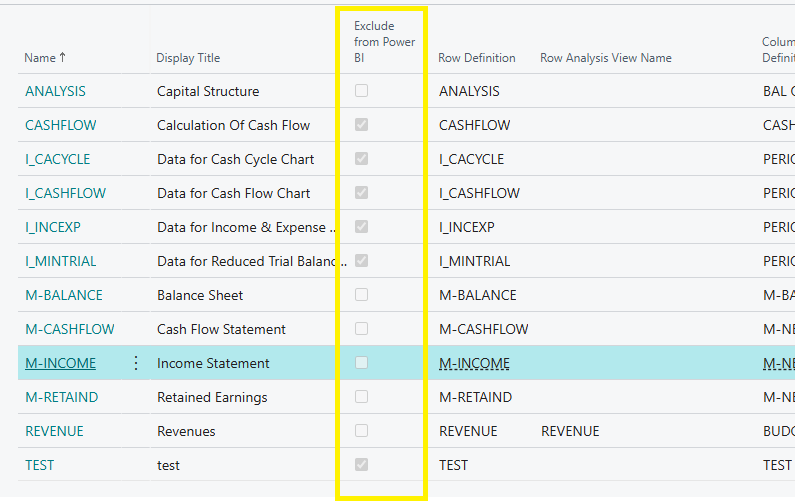 A new field, “Exclude from Power BI”, has been added to the Financial Report screen in Business Central. By selecting this field, you can prevent specific reports from being imported and displayed in Power BI.