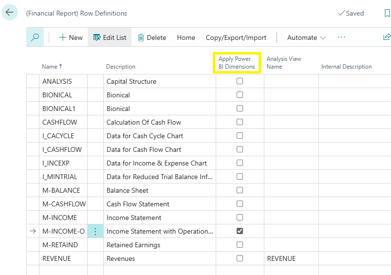 Once these dimensions are selected in Power BI Insights Connector, they will automatically appear in your Row Definitions within Business Central..png)