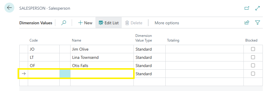 Step 2.2: Assign Salesperson to an available Shortcut Dimension slot