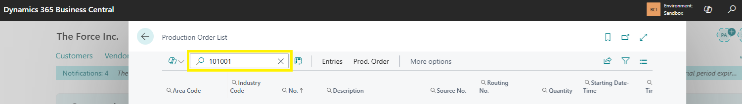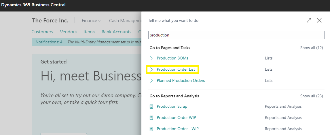 Use Tell me (Alt + Q) and search for the corresponding list page (example "Production Order List")