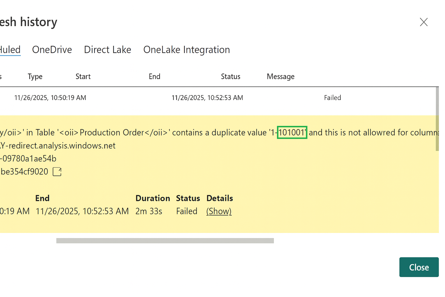 This means Power BI has found duplicate records in the underlying Business Central table the report depends on. Until the duplicate is removed or corrected, the affected Insights app cannot refresh successfully.